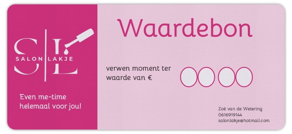 Op zoek naar een origineel cadeau? Geef het plezier van prachtige nagels met een cadeaubon van Salonlakje. Ideaal voor verjaardagen, feestdagen of gewoon om iemand te verwennen. De ontvanger kan zelf kiezen uit onze diensten of producten.
